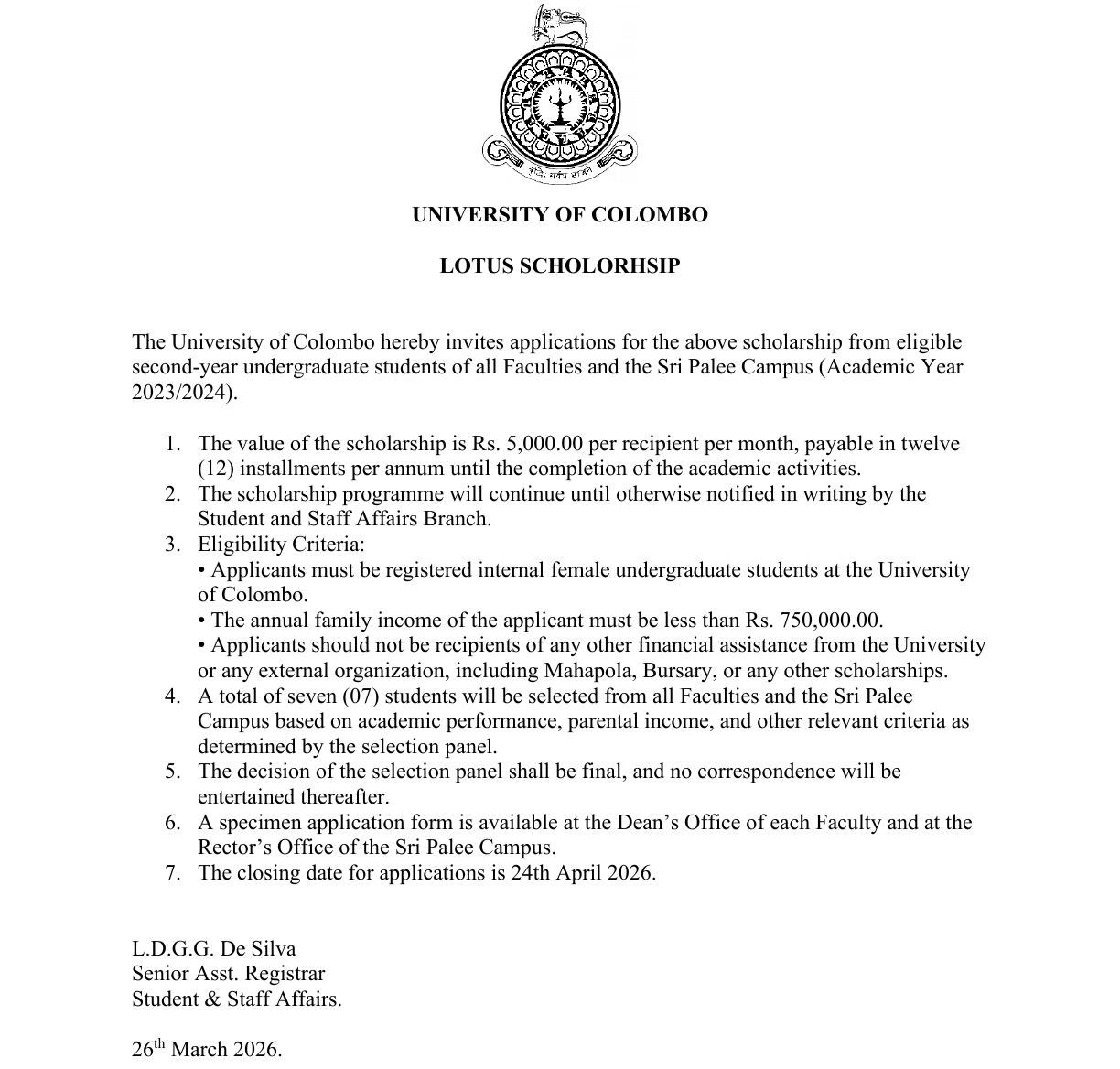 Calling Applications - Lotus Scholorship for the female undergraduate students of UOC